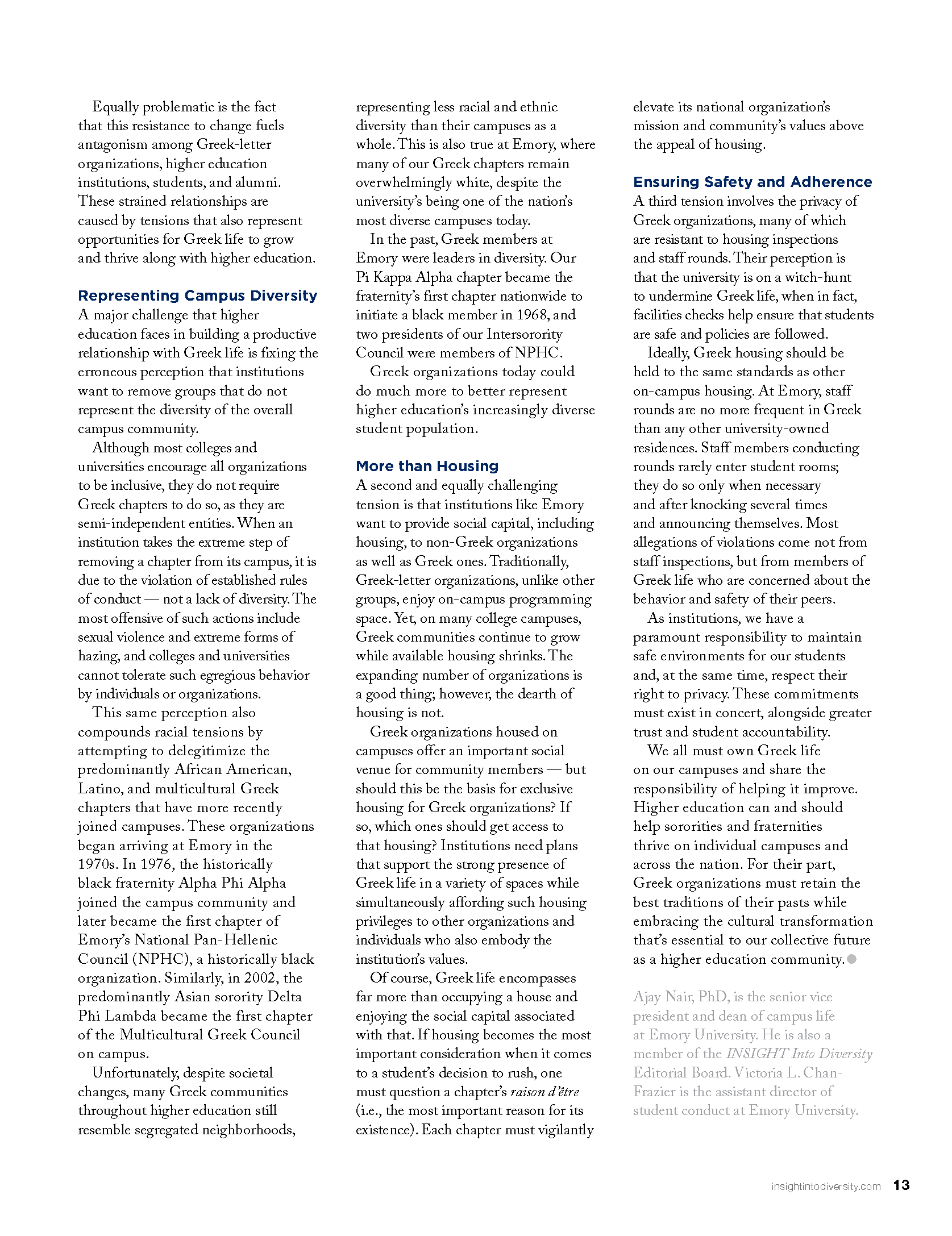 Dr. Ajay Nair and Victoria L. Chan-Frazier explicate the assets and challenges of Greek life in higher education in the newest edition of INSIGHT Into Diversity.